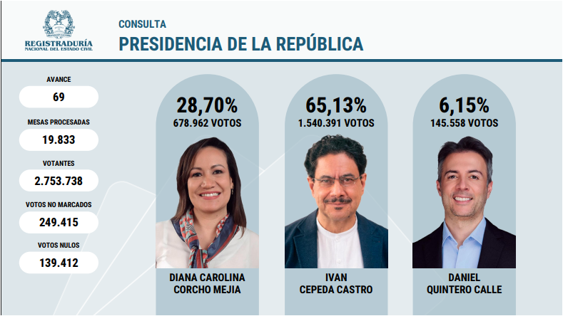 Con el 99% de las mesas escrutadas (Boletín 69), el senador y filósofo Iván Cepeda se impuso con más del 65% de la votación, superando a Carolina Corcho. El triunfo es crucial, pero la baja participación enciende alertas rumbo al 2026.